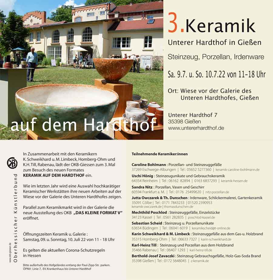 In Zusammenarbeit mit dem Oberhessischen Künstlerbund OKB, findet am Sa. 9.7. u. So. 10.7.22 von 11-18 Uhr bereits zum 3.Mal „KERAMIK AUF DEM HARDTHOF“ statt.